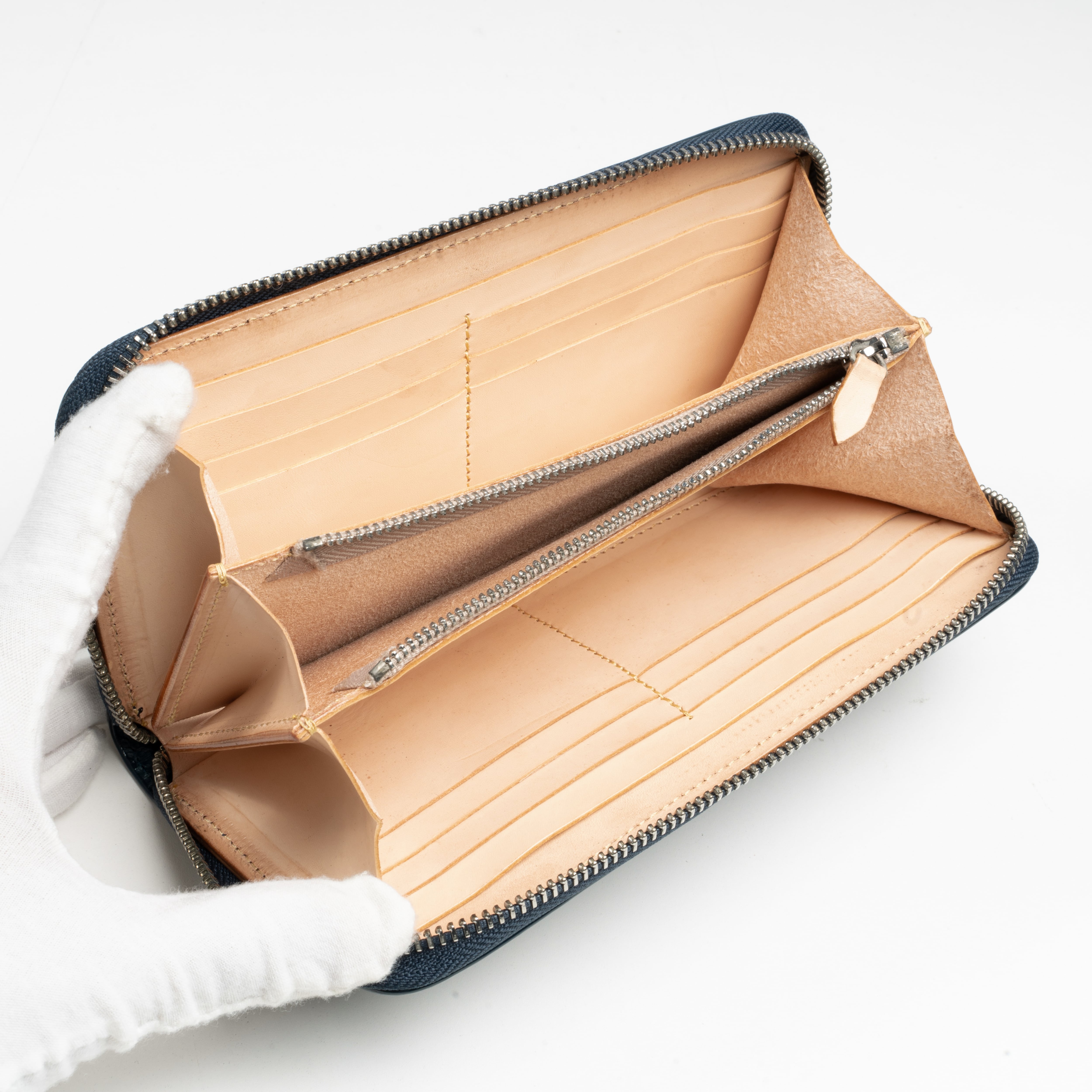 アイテム情報 【サイズ】 W(幅)約 19.2cm×H(高)約 10cm× 厚み 2.4約 cm 【重さ】 280 g 【カラー】 ネービー 【素材】 外側:牛革 内側:牛革 【仕様】 札入れx2、フリーポケットx2、カード入れx12、小銭入れ×1