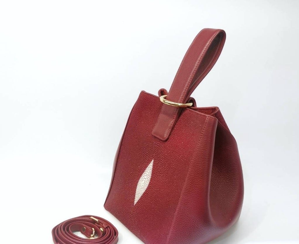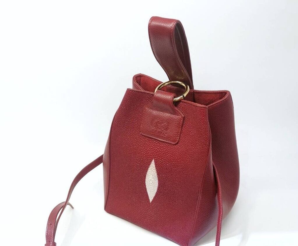 【サイズ】 幅 18cm、長さ 16 cm、高さ 34.5 cm 【カラー】 1 色 【素材】 アカスティングレイ エイ革 牛革 【仕様】 ポケット x 3